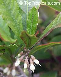 familia Sapotaceae, árbol perenne, pequeñas flores blancas, bayas elongadas color rojo,